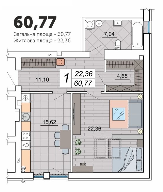 1-кімнатна мансардна квартира у «Юпітері» площею 60,77 кв.м