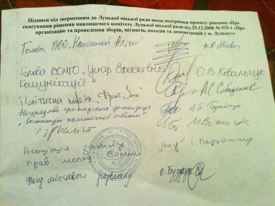 «Наслідками такого рішення Луцького міськвиконкому в майбутньому можуть стати вибіркові або масові систематичні репресії проти організаторів та учасників мирних зібрань в місті», - повідомляють активісти коаліції «За мирний протест».