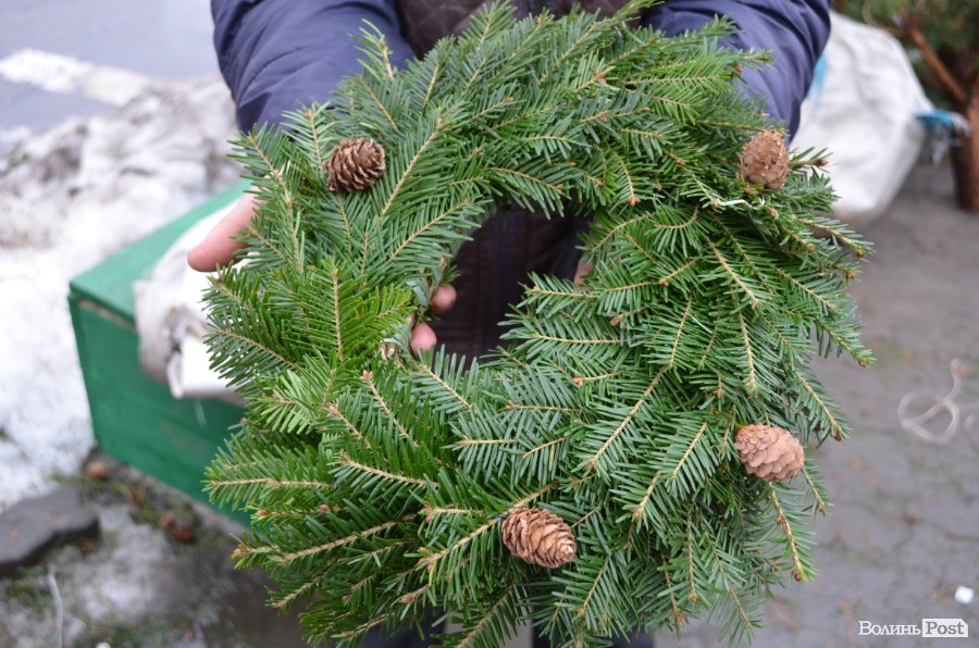 Продають на ринку й готові віночки з гілок ялинки. Коштує такий новорічний декор приблизно 50 гривень. Маленькі шишки на ньому – бонус для покупців.