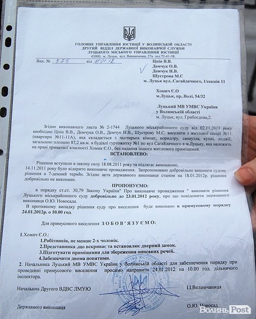 Згідно з постановою Головного управління юстиції у Волинській області, копію якої мали при собі мітингуючи, чотирьох мешканців гуртожитку потрібно примусово виселити 24 січня 2012 року без надання іншого житла. Серед них – Валентина Цпін.