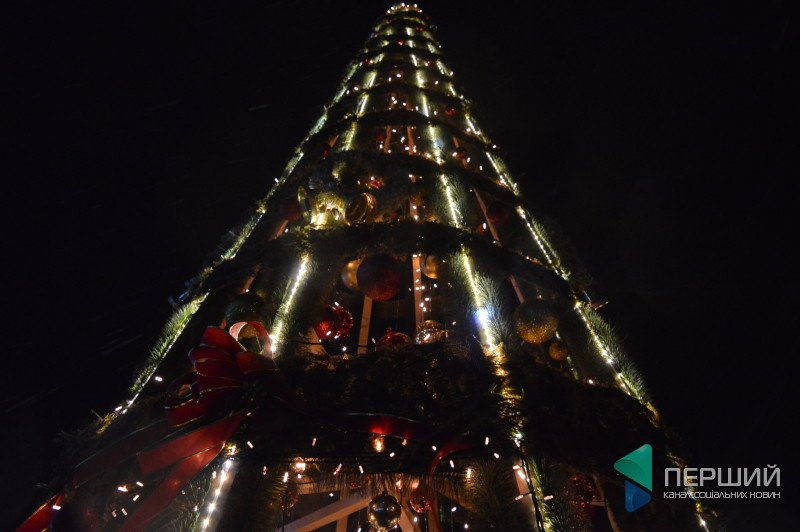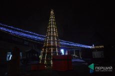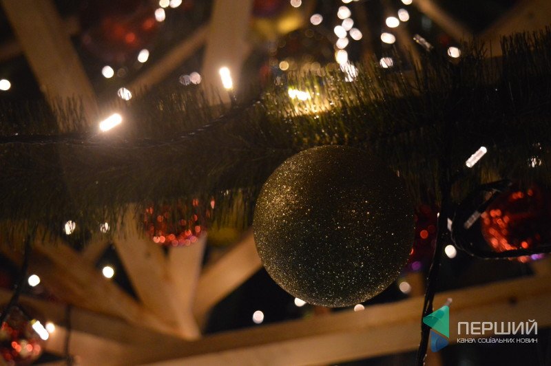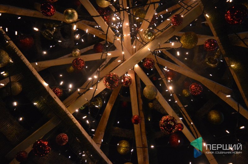 Встановили оригінальну штучну ялинку. Каркас у неї дерев’яний, «зелень» штучна зі смугами справжнього моху. Прикрашена сріблястими та червоними кульками.