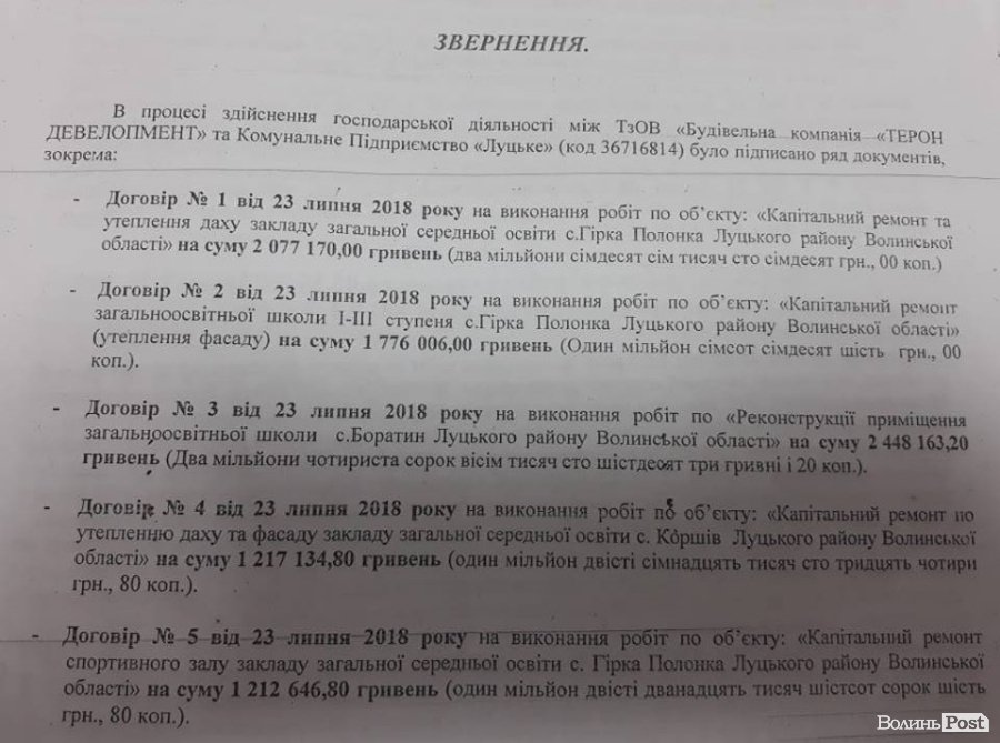 «Перший договір КП «Луцьке» уклало з львівською фірмою «Будівельна компанія «ТЕРОН ДЕВЕЛОПМЕНТ» на суму 2 мільйони 77 тисяч гривень на капітальний ремонт та утеплення даху школи. Другий договір підписали на утеплення фасаду на суму 1 мільйон 776 тисяч гривень. І третій договір – на виконання робіт щодо ремонту спортивного залу школи на суму 1 мільйон 212 тисяч гривень», – розповіла Ніна Симонович.