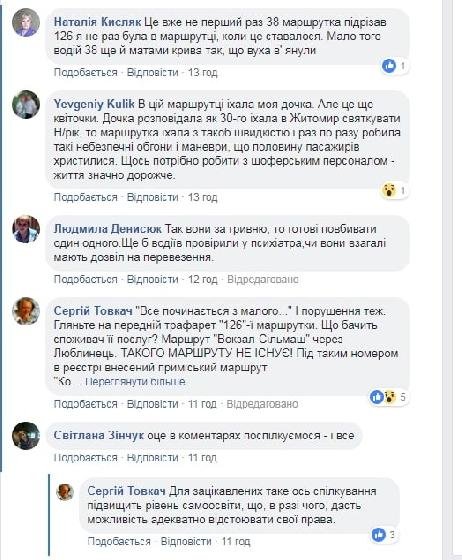 Свої коментарі щодо даної пригоди залишили під світлинами й численні дописувачі. Приміром, Наталія Кисляк пише, що, будучи пасажиром однієї з цих маршруток, вона неодноразово через небезпечні на дорозі маневри одного з водіїв вже потрапляла в ось такі неприємні розбірки. А ще - жінка обурюється нахабним ставленням водія до людей, яких той перевозить.