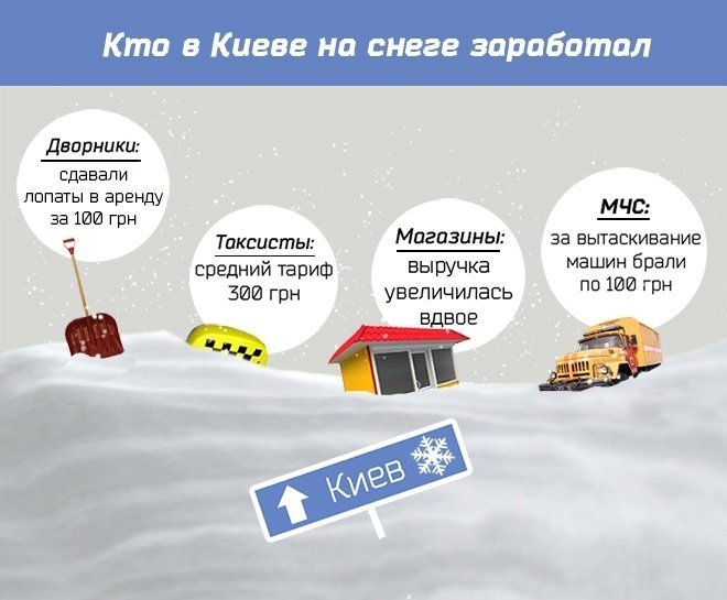 Деякі кияни змогли непогано заробити в період снігопадів. Щасливчиками в ці вихідні стали таксисти, водії мікроавтобусів і джипів, а також власники продуктових магазинів. Двірники, водії тракторів і МНСники теж не залишилися без грошей.