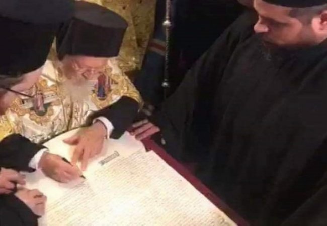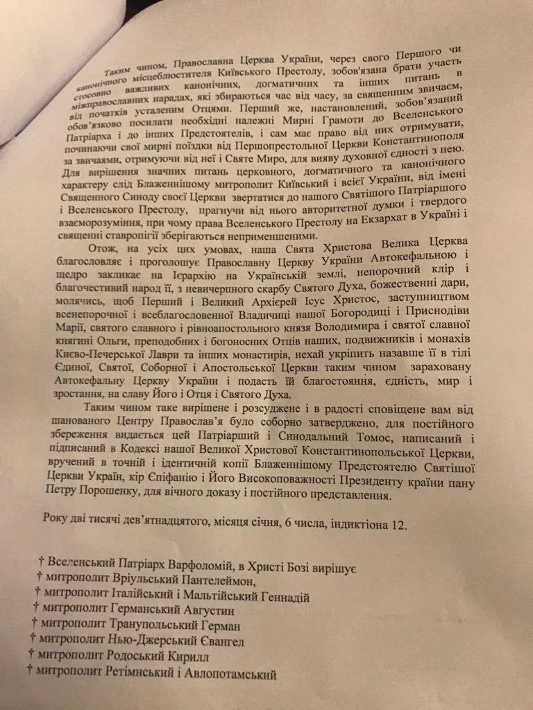 "...Таким чином таке вирішене і розсуджене і в радості сповіщене вам від шанованого Центру Православ'я було соборно затверджено, для постійного збереження видається цей Патріарший і Синодальний Томос,.. вручений в точній і ідентичній копії Блаженнішому предстоятелю Святішої Церкви України, кір Єпіфанію і Його Високоповажності Президенту країни пану Петру Порошенку, для вічного доказу і постійного представлення. Року дві тисяч дев'ятнадцятого, місяця січня, 6 числа, індиктіона 12", - йдеться у документі.