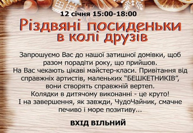“Запрошуємо до нашої затишної домівки, щоб разом порадіти року що щойно прийшов та Великому світлому святу Різдва Христового. За цікавою дружньою роботою поспілкуємось, спробуємо будувати плани на майбутнє. На Вас чекають цікаві майстер-класи, привітання від справжніх артистів —стуДії “Бешкетники”, вони створять справжній вертеп. Колядки в дитячому виконанні — це круто! І на завершення, як завжди, ЧудоЧайник, смачне печиво і море позитиву”, — кажуть організатори.