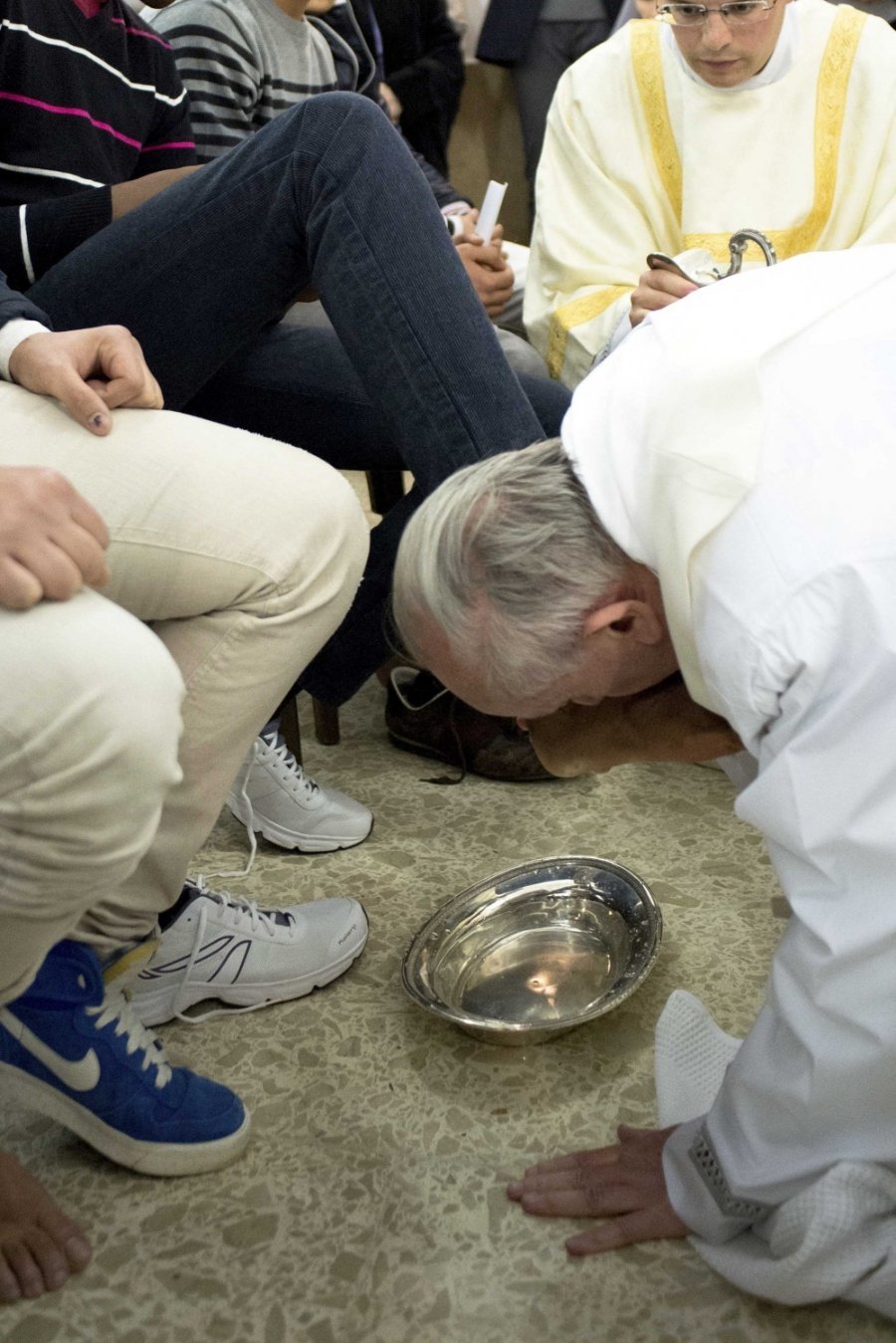 Понтифік омив і поцілував ноги 12-ом малолітнім вʼязням різних національностей і віросповідань, серед яких були також і мусульмани ‒ так, як Ісус Христос на Тайній вечері омив ноги 12-ом апостолам. І вперше серед обраних для церемонії були дві дівчини. Папа витер ноги підлітків рушником, витканим із 720 ниток, які привезли з місць, повʼязаних із земним шляхом Христа.