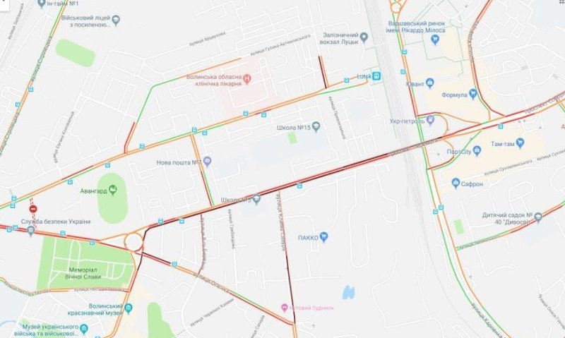 За даними картографічних сервісів, рівень заторів на проспекті Перемоги максимальний – дорога позначена бордовим кольором.