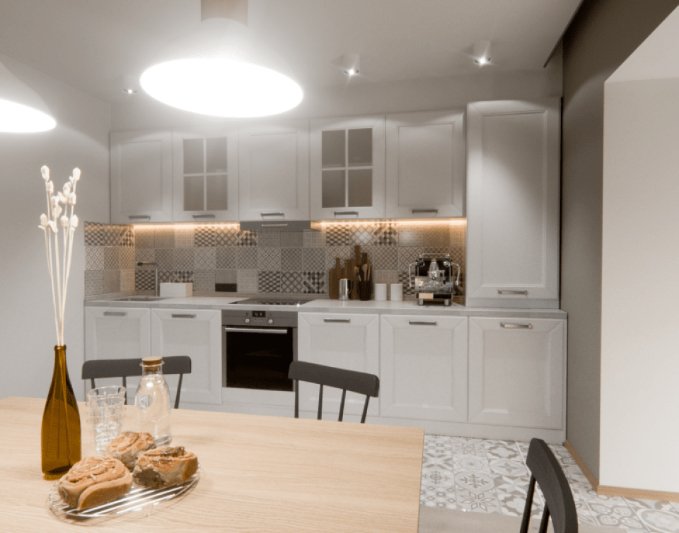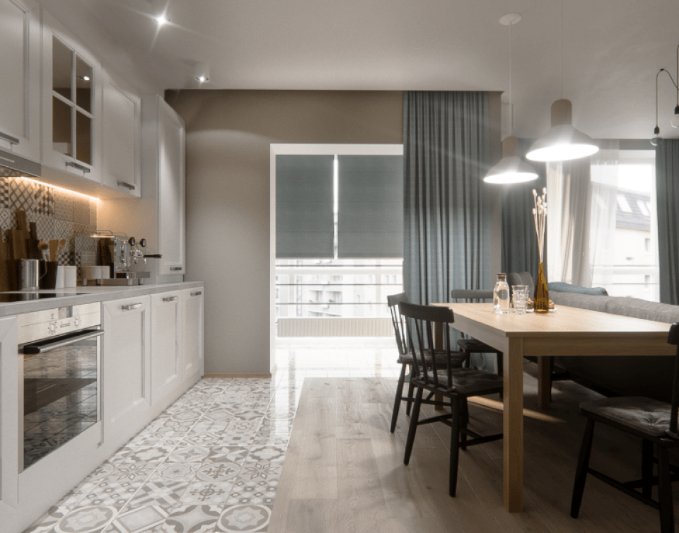Тут простора кухня площею 20 квадратів. Її можна зонувати на столову та вітальню. Хоча, можна залишити як звичайну кухню: будь-якій господині приємніше готувати де багато вільного місця ;)