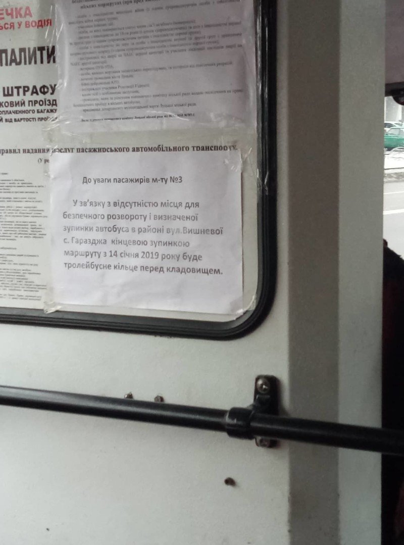 Оголошення про зміну маршруту розмістили у автобусах, пише Перший.