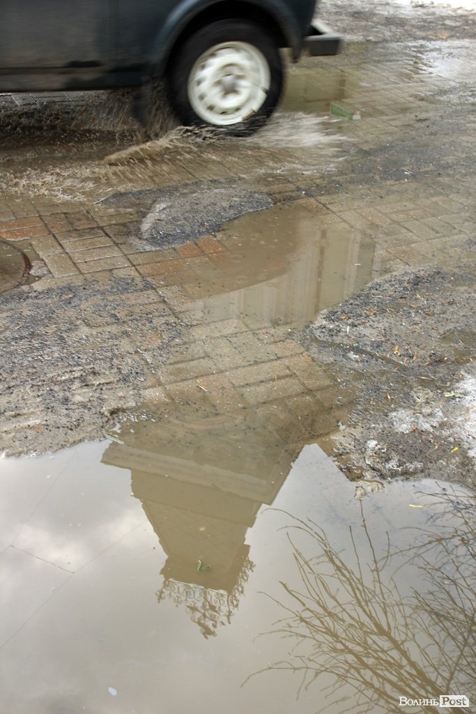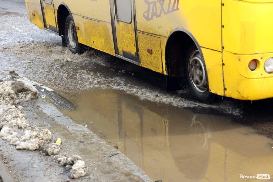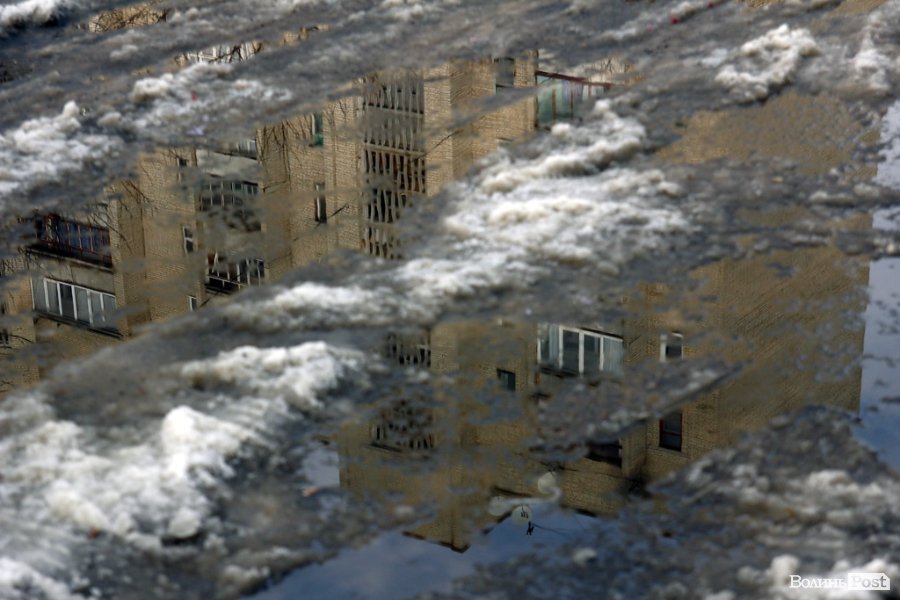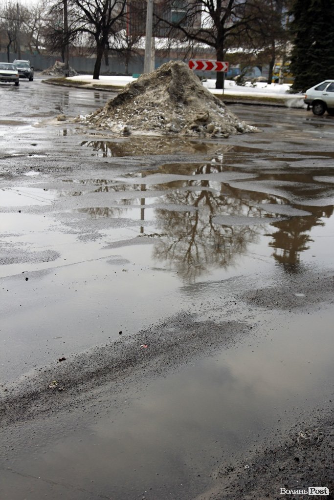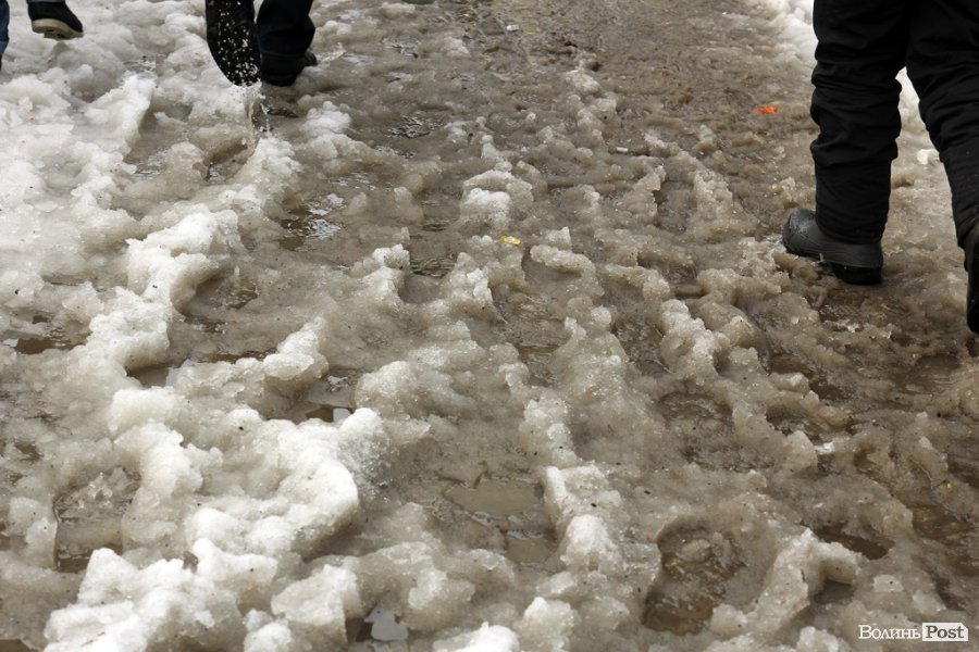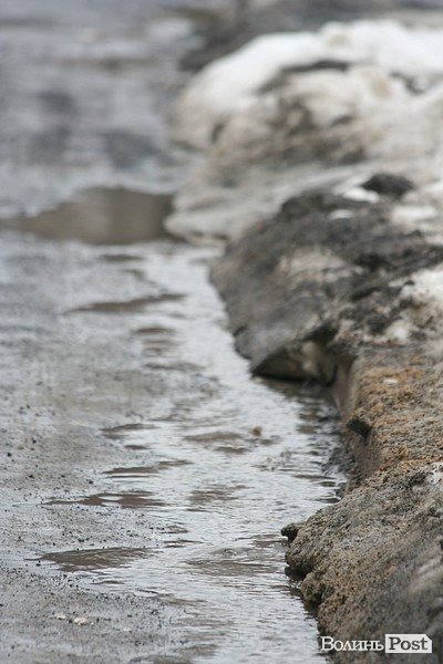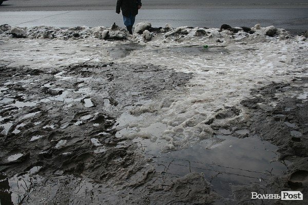 На вулицях міста ‒ калюжі та "каша" з підталого снігу, болота та води. Лучани, перескакуючи з острівця на острівець, вправно маневрують між ними.
