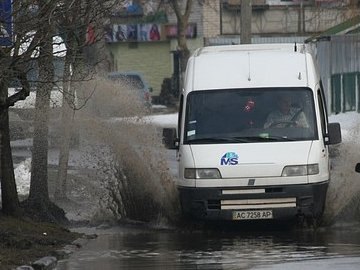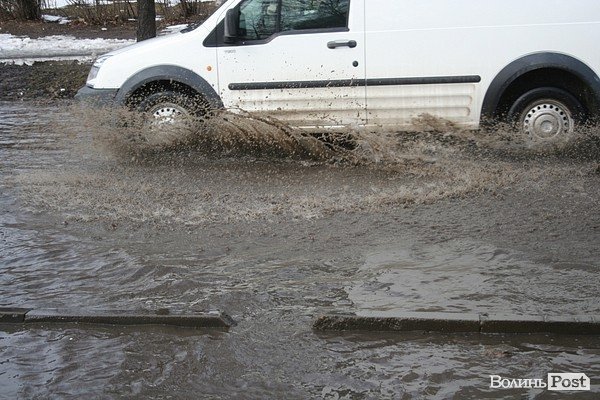 Вулицю Ветеранів у Луцьку залило водою у перший день відлиги - місцями тротуари повністю розкисли, величезна калюжа утруднює рух авто, просідає ґрунт.