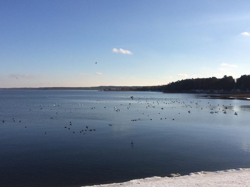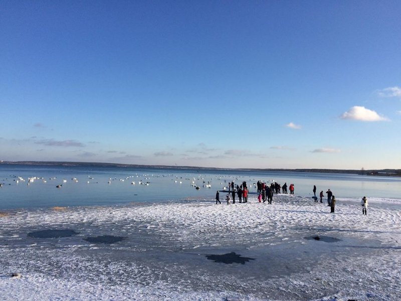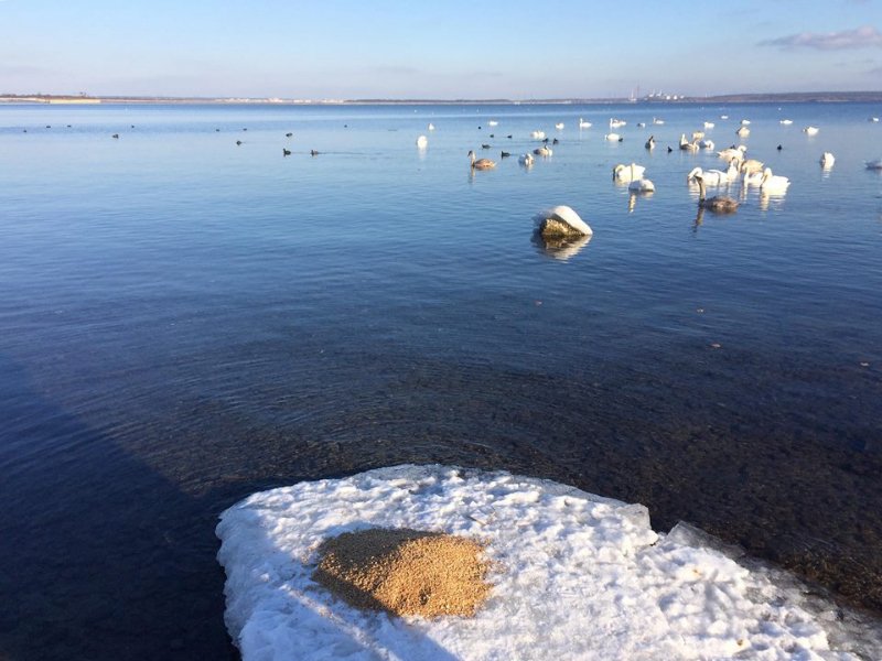 Тут на льоду для качок та лебедів залишають зерно, хліб. На снігу добре помітні сліди птахів. Вочевидь, вони ходять берегом, коли поблизу нікого немає.