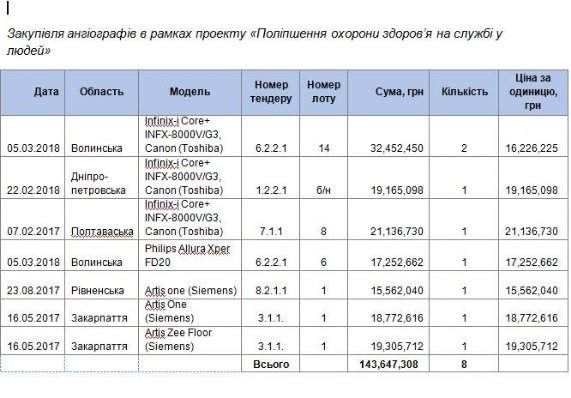 По Україні загалом групи управління субпроектами (далі ГУС) провели 7 закупівель ангіографів і придбали 8 ангіографів чотирьох різних моделей на загальну суму 143,6 мільйона гривень.