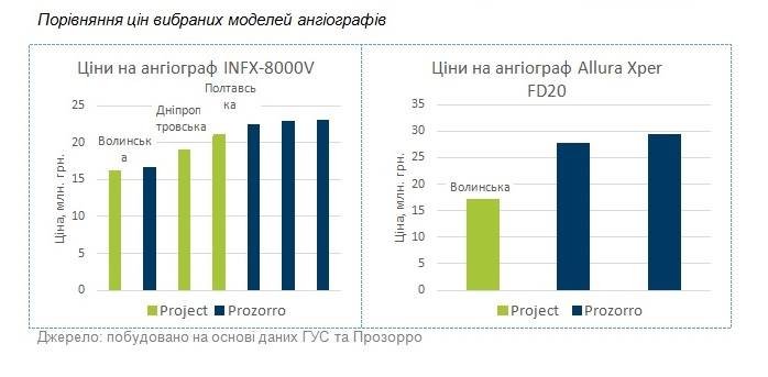 Ціни на ангіографи, закуплені в рамках проекту, були нижчими за середні для країни (18 мільйонів гривень проти 24 мільйонів відповідно, тоді як мінімальна ціна ангіографа в «Прозорро» становить 17,4 мільйона гривень). Цей результат також підтверджується на прикладі ідентичних моделей ангіографів. Аналіз технічних характеристик ангіографів показує, що моделі, придбані в рамках Проекту, не поступаються моделям, купленим через «Прозорро», але мають нижчі ціни. Враховуючи середню різницю в ціні, загальний обсяг оцінюваної економії для всіх закупівель «Прозорро» може досягти 141,4 мільйона гривень з 555,3 мільйона гривень (25,5%).