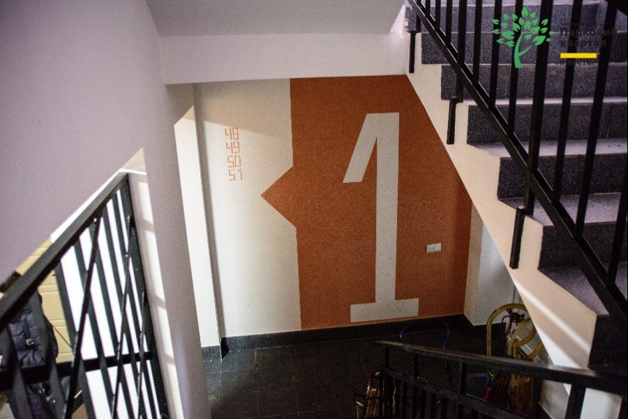 У першому під’їзді встановлені вікна, проведена електрика, наразі чекають потепління для того, щоб заштукатурити стіни. Також на сходовій клітці встановлені перила.