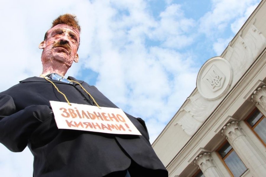 Попереду колони несуть ляльку голови Київської міської держадміністрації Олександра Попова з підписом звільнено киянами.