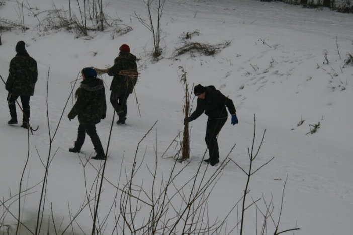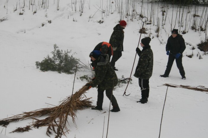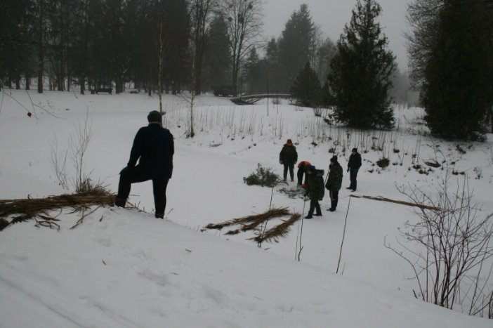 Комунальники також прорізують нові невеликі ополонки, в які вставляють заготовлені снопи очерету для збагачення води киснем.