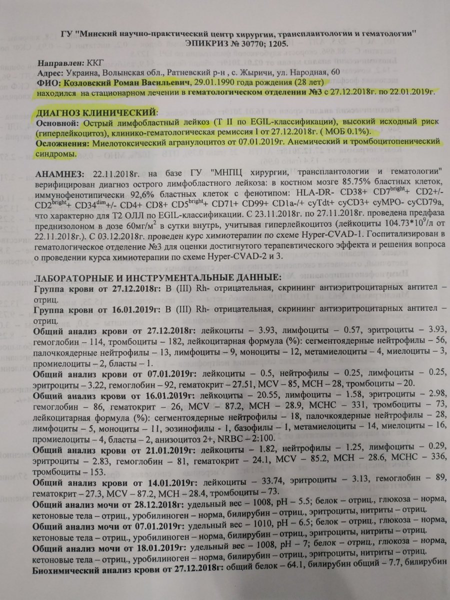 Після виписки Роман поїхав в Мінськ, де діагноз підтвердився. Наразі чоловік знаходиться на лікуванні в Мінську, вже пройшов два курси хіміотерапії 1-го блоку. Лікарі кажуть, після проходження курсів хіміотерапії, а їх потрібно пройти вісім, потрібна буде трансплантація кісткового мозку, ціну назвали у 120 тисяч доларів.