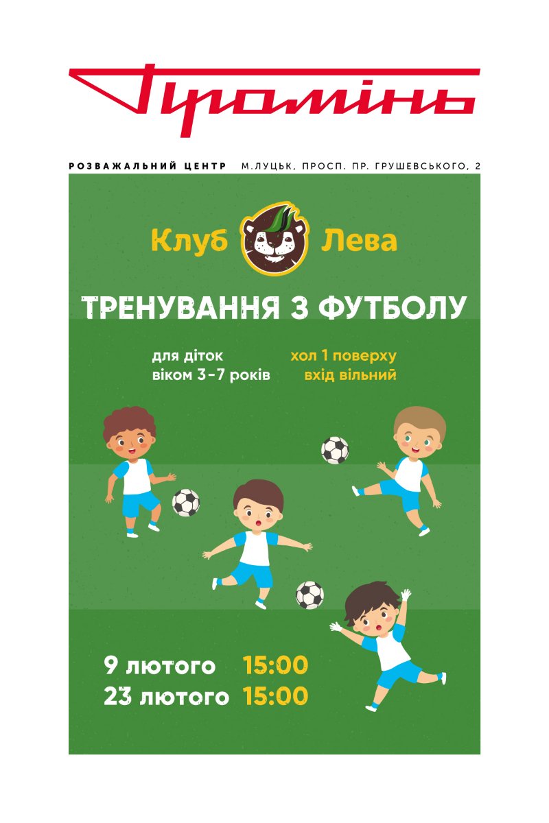 9 та 23 лютого о 15:00 у холі РЦ «Промінь» відбудеться безкоштовне заняття з футболу для дітей віком від 3-х до 7 років від «Клубу Лева».