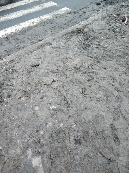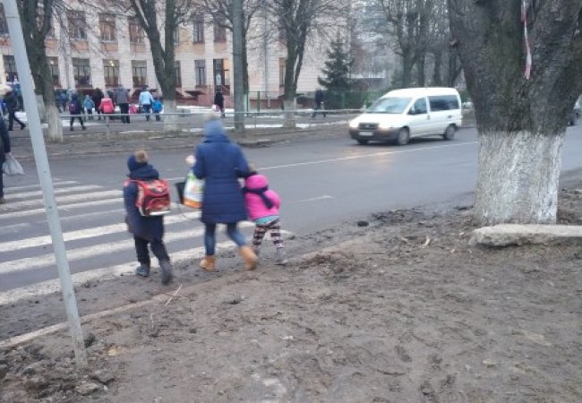"По обидва боки пішохідного переходу (поруч з ЗОШ №7) замість впорядкованих підходів болото. Діти по такому "тротуару" йдуть в школу. Фото додаються", - написав він.