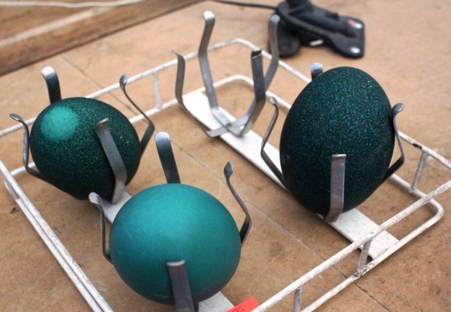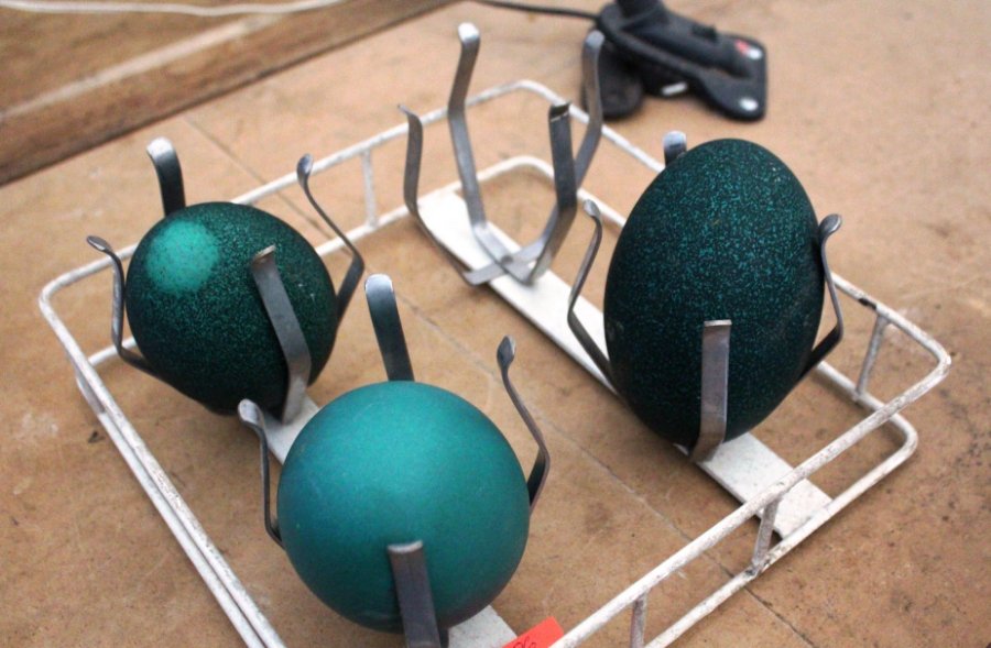 Анатолій Прилуцький каже, що одне страусине яйце може важити понад кілограм, а також показав незвичний продукт – зелене яйце ему. Колір страусиного ж, каже, більш схоже до рожевого. За словами Анатолія Прилуцького, одне страусине яйце може важити до 1,300 кілограма.