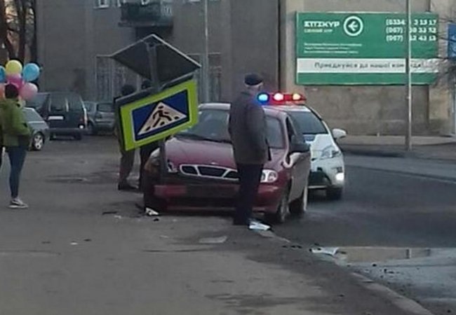 Збитий знак вказував на наявність пішохідного переходу. Розмітки-зебри, як видно на фото, на дорозі не було. Імовірно, водій, не вибравши безпечної швидкості, загальмував перед переходом та повернув кермо.