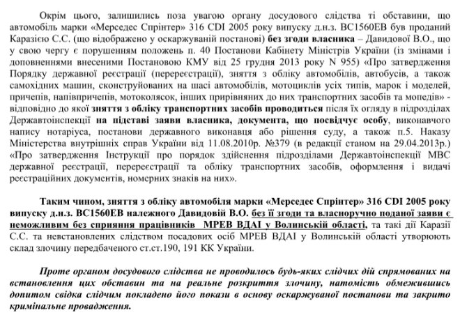 «У заяві на продаж автомобіля стоїть не підпис власниці. Я не знаю, чий, бо по справі почеркознавча експертиза не призначалася і проведена не була. Хоча з таким клопотанням до слідчого ми зверталися і навіть давали взірці підписів заявниці. При подачі заяви на продаж, МРЕВ мало того, що отримує заяву з підписом особи, то також подається разом з документами, окрім технічного паспорта, також і паспорт особи, яка продає авто. Тобто не просто копія паспорта, а оригінал. Людина має бути там на місці, працівник МРЕВ має пересвідчитися, що це саме та людина, що це її паспорт і тоді цей договір оформляють. Вікторії у МРЕВ на Волині взагалі ніколи в житті не було. Тому ми вважаємо, що працівники МРЕВ були зацікавленні, тому ніхто нічого і не перевіряв», – зазначив адвокат.