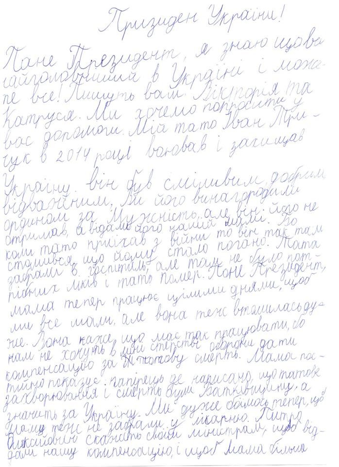 «Пане Президент, я знаю, що ви найголовніший Україні і можете все! Пишуть вам Вікторія і Катруся. Ми хочемо попросити у вас допомоги. Мій тато Іван Тричук 2104 році воював і захищав Україну. Він був сміливим, добрим, відважним. Ви його нагородили орденом за Мужність, але він його не отримав, а віддали його нашій мамі. Бо коли тато приїхав з війни, то він так там стомився, що йому стало погано. Тата забрали в госпіталь, але там не було потрібних ліків і тато помер. Пане Президент тепер мамам працює цілими днями, щоб ми все мали, але вона теж втомлюється дуже. Вона каже, що має так працювати, бо нам не хочуть в міністерстві оборони дати компенсацію за татову смерть. Мама постійно показує папірець де написано, шо татове захворювання і смерть були за Батьківщину, а значить за Україну. Ми дуже боїмося тепер, щоб маму теж не забрали в лікарню. Петро Олексійович скажіть своїм міністрам щоб віддали нашу компенсацію і щоб мама більше неплакала, бо тато захищав Батьківщину. Дякуємо! Слава Україні!».