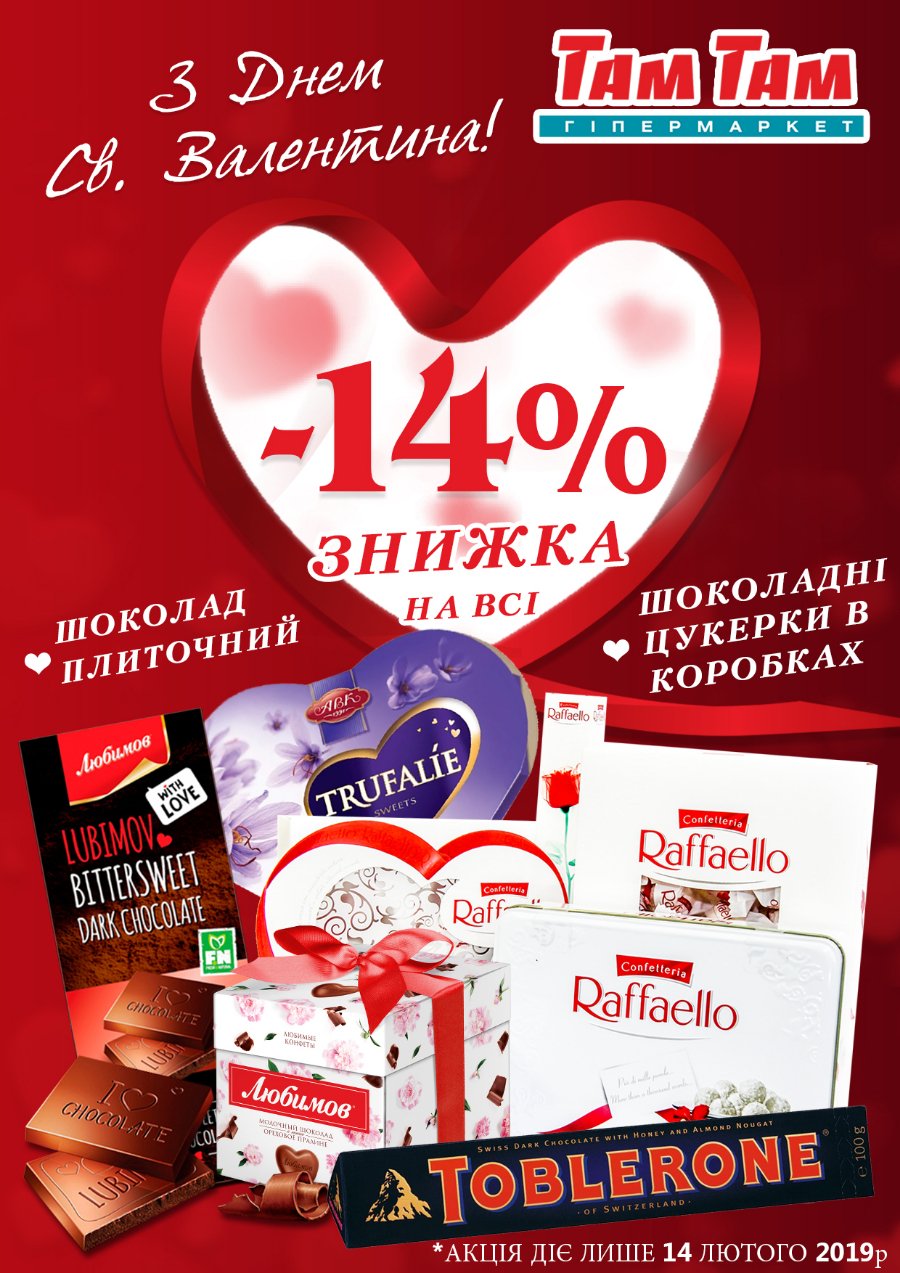 Лише 14 лютого 2019 року: Знижка -14% на ВСІ: шоколадні цукерки в коробках та плитки шоколаду.