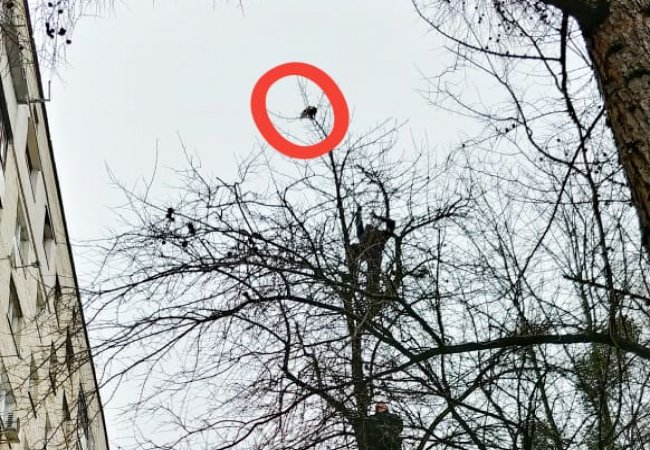 У Луцьку на проспекті Молоді, 11 рятувальники без страховки вилізли на височезне дерево, аби врятувати кота.