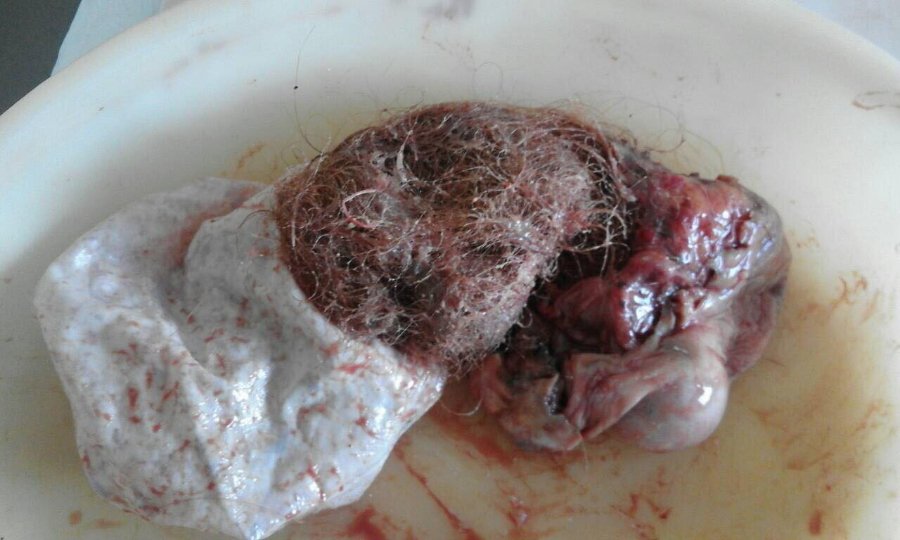 "Пацієнтка мала надлишкову вагу (110 кг), тому звичайну лапароскопічну операцію провести було складно, - розповідає завідувачка відділення малаінвазивної хірургії Ганна Колесник, - через 3 отвори вдалось видалити цю кістому. Вона виявилась дермоїдною великих розмірів, всередині якої були зуби, волосся, нижня челюсть, бурий жир".