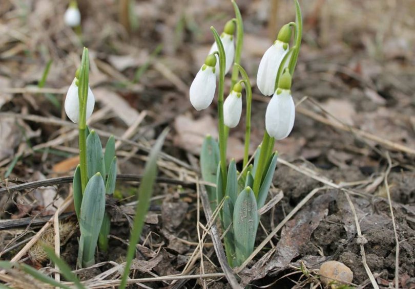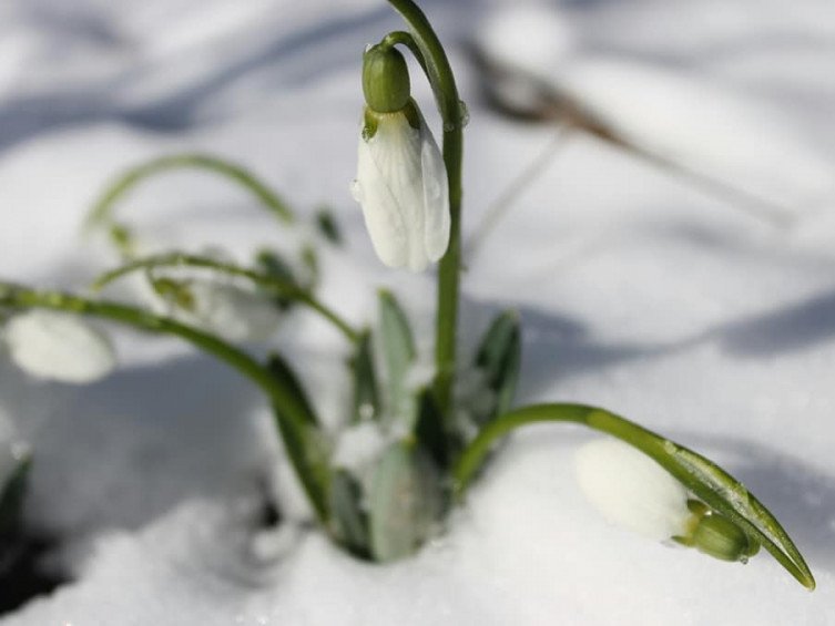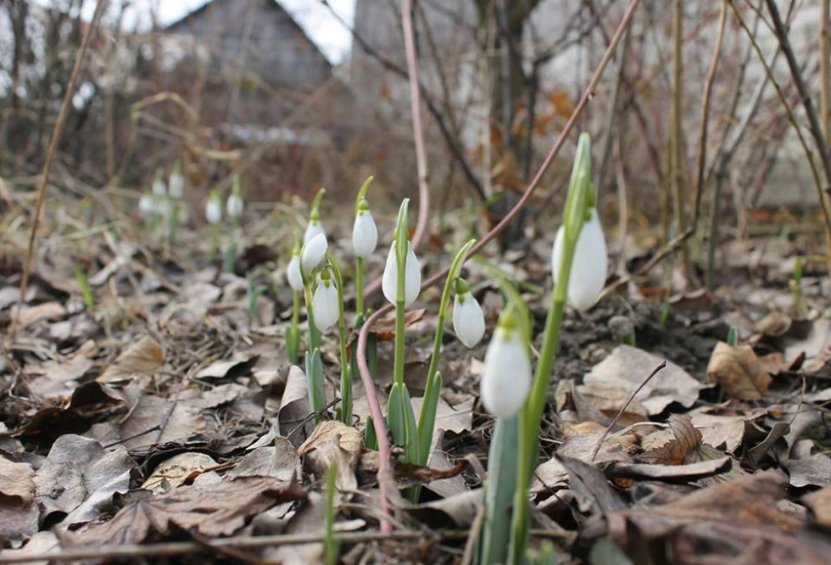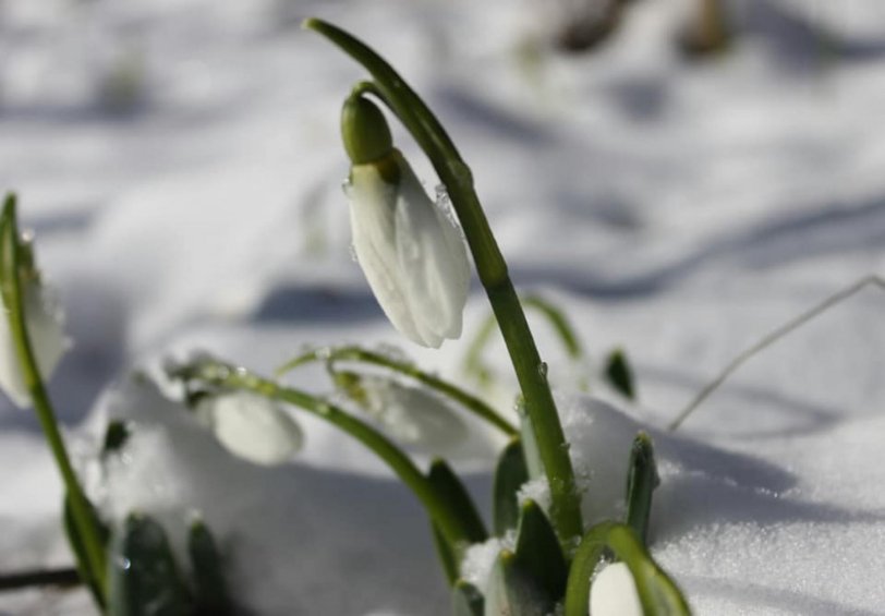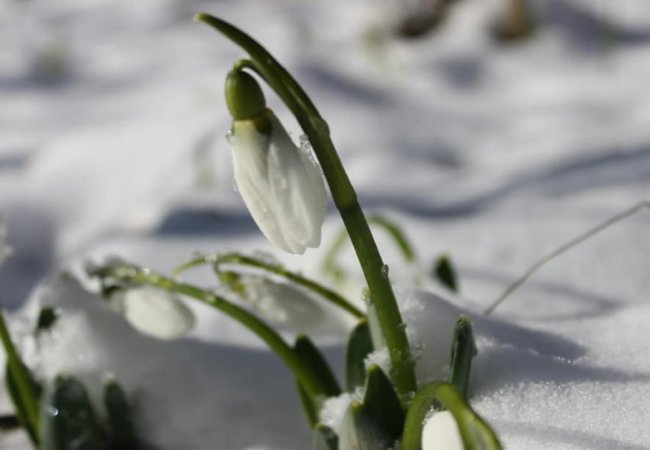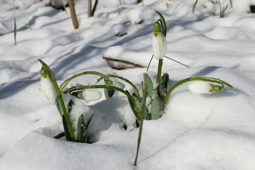 Підсніжники розцвіли, коли сніг вже зійшов. Однак рослини не злякалися повернення холоду й продовжують квітнути під снігом.