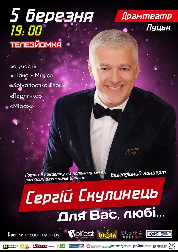 5 березня, о 19:00 у Волинському обласному драматичному театрі відбудеться сольний концерт Заслуженого артиста естрадного мистецтва України, композитора – Сергія Скулинця.