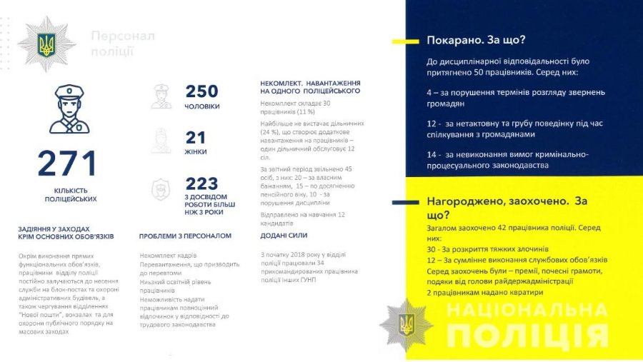 Окрім того, звіт включатиме інформацію як про заохочення поліцейських, так і про притягнення їх до дисциплінарної відповідальності. Також громада володітиме інформацією про проблеми з персоналом, некомплект, навантаження на одного поліцейського тощо.