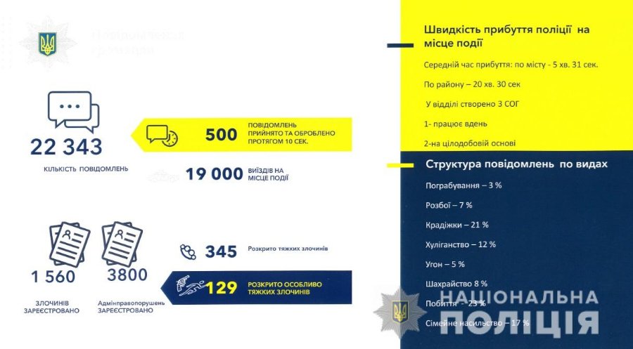 Звіт включатиме інформацію про середню швидкість прибуття поліції на виклик, про загальну кількість повідомлень, прийнятих та оброблених, наприклад, за 10 секунд тощо.