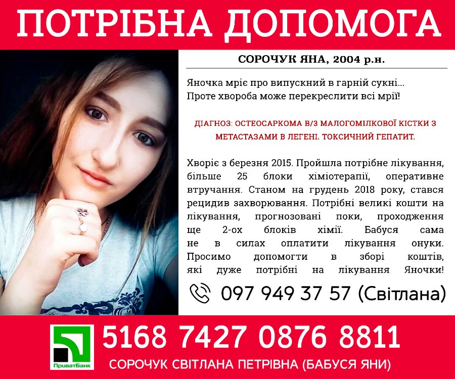 Нині Яна Сорочук потребує дороговартісного лікування, яке бабуся не може оплатити самостійно.