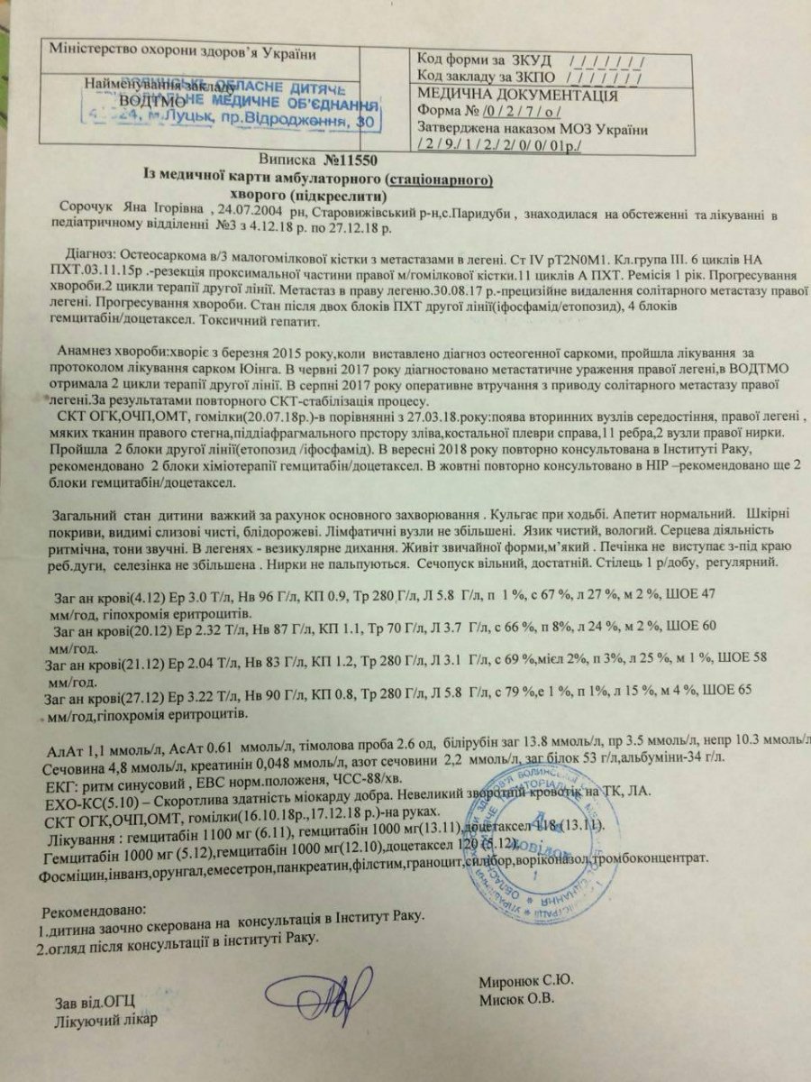 В 2015 році школярці поставили діагноз остеосаркома в/з малогомілкової кістки з метастазами в легені, токсичний гепатит.