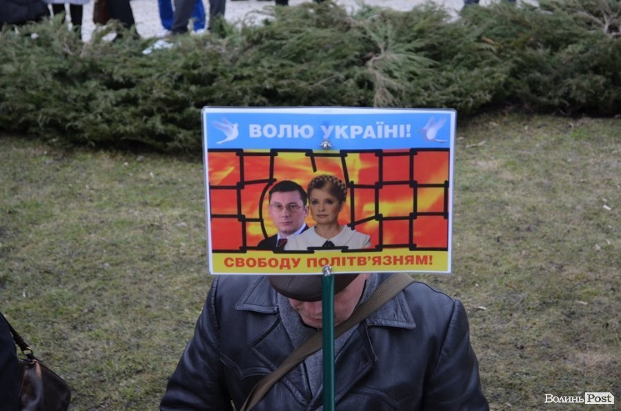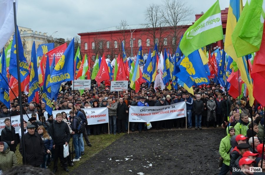 Прихильники опозиції тримали у руках плакати із закликами скасування пенсійної реформи, проведення виборів у Києві, відставки Кабінету міністрів, вимогою звільнити Юлію Тимошенко.