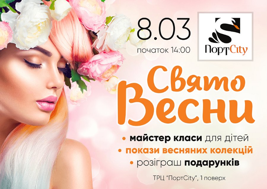8 березня о 14 годині на 1 поверсі ТРЦ «ПортCity» розпочнеться святкова програма. На Вас чекають покази весняних колекцій від магазинів ТРЦ «ПортCity», презентація нового формату магазину А. Тan, майстер-класи для дітей по виготовленню листівок та подарунків, а також виступ вокальних колективів Луцька. І це ще не все! Серед гостей ТРЦ «ПортCity» будуть розіграні цінні подарунки та грошові сертифікати на покупки у магазинах, що знаходяться у ТРЦ «ПортCity».