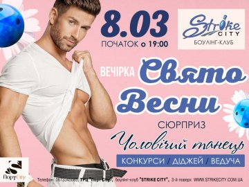 На Свято весни боулінг-клуб StrikeCity готує для жінок незвичайні сюрпризи. 8 березня о 19 годині розпочнеться святкування під час якого відбудуться розваги з ведучою, весняні конкурси, музичний супровід від діджея. Сюрприз для жінок – чоловічий танець, який не залишить байдужими нікого!