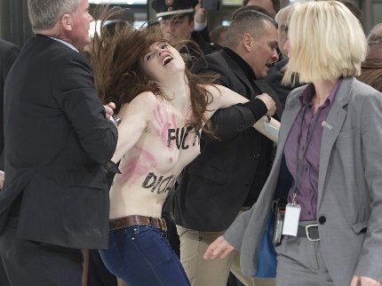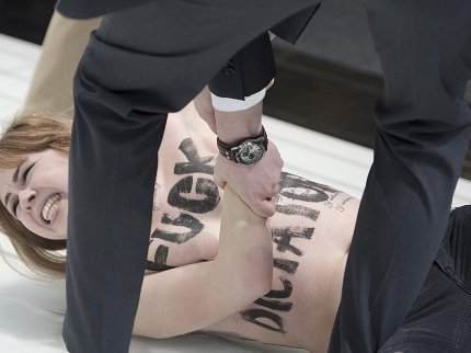 Присутні на виставці журналісти поки не повідомляють, чому була присвячена сьогоднішня акція Femen.