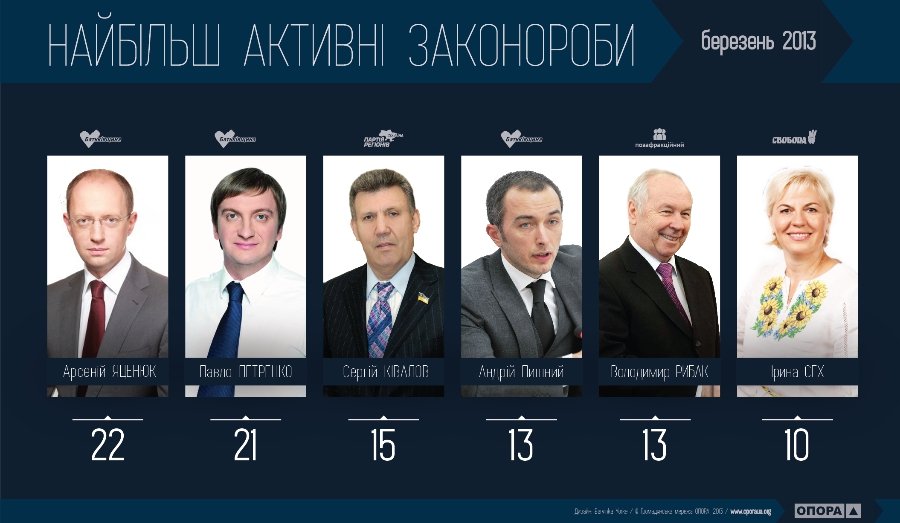 Найбільш активними законотворцями в межах усього парламенту виявились два представники «Батьківщини», а саме, Арсеній Яценюк (22 законопроекти) та Павло Петренко (21).