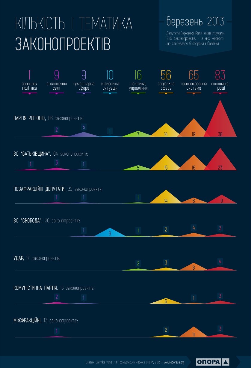 Цією ж темою найбільше переймалась і ВО «Батьківщина» – було зареєстровано 23 законопроекти. Серед пріоритетів «Свободи» – екологічна ситуація (9 законопроектів). «УДАР» переймався правоохоронною системою (8 законопроектів). КПУ зосередила законотворчу активність на питаннях соціальної політики та стандартів (6 законопроектів), як і позафракційні депутати (14 законопроектів).