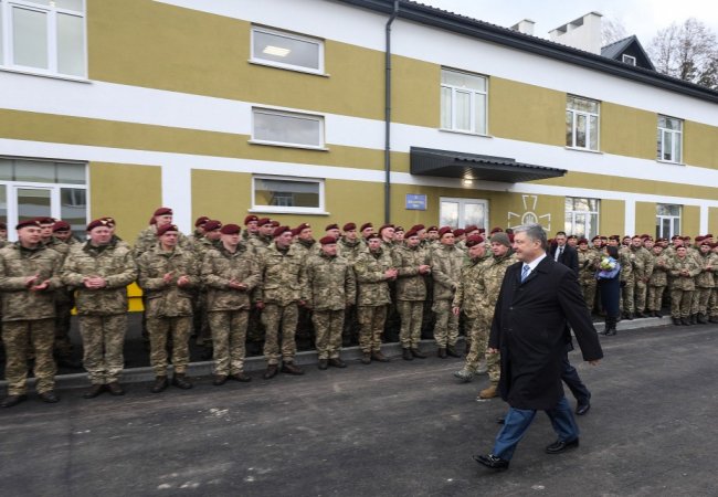 «В якості першого пріоритету я сказав, що ми будемо будувати завод по виробництву боєприпасів, будувати найсучасніші зразки озброєння, в тому числі і для десантно-штурмових військ. І запустимо програму побудови для 23 тисяч контрактників 184 гуртожитків. І сьогодні перша черга вводиться в експлуатацію. Сподіваюся, що більшість із вас будуть мати можливість оселитися у комфортабельні кімнати», - сказав Петро Порошенко.