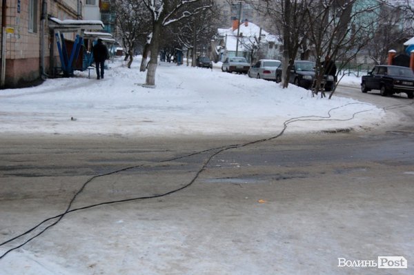 До речі, електричний провід, якого донедавна тримав збитий стовп, протягом цілого дня вівторка, 24 січня лежав на асфальті в снігу.