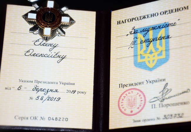 Медика 14 ОМБр Олену нагородили орденом «За мужність» ІІІ ступеня. Відзнаку жінці вручив Президент України Петро Порошенко.
