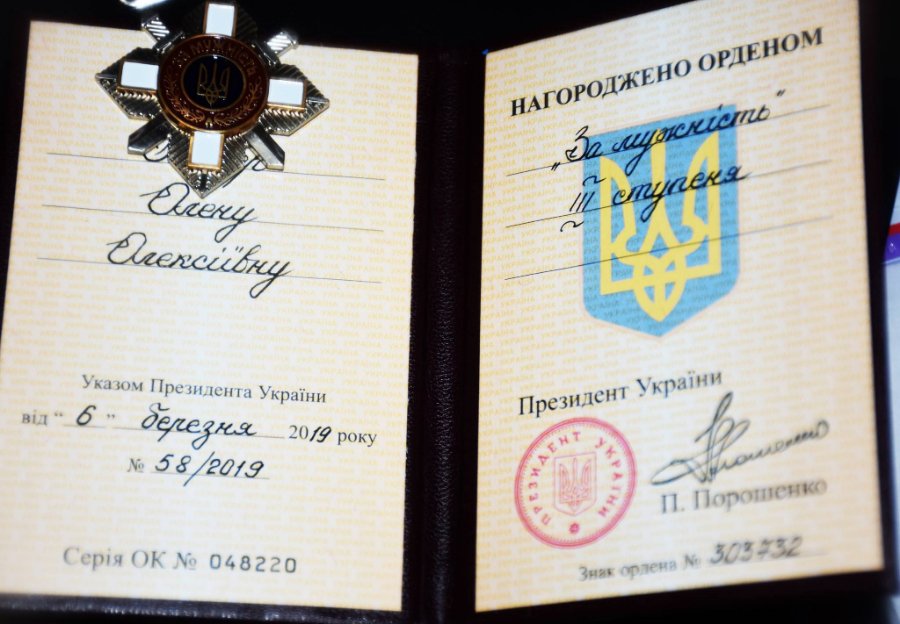 "Наша гордість! Наш медик від Бога! Наша Олена – перша і єдина, поки що, жінка-військовослужбовець у нашій народженій та загартованій в боях 14 окремій механізованій бригаді, нагороджена орденом «За мужність» ІІІ ступеня! Високу нагороду їй вручив особисто Президент України Петро Порошенко.