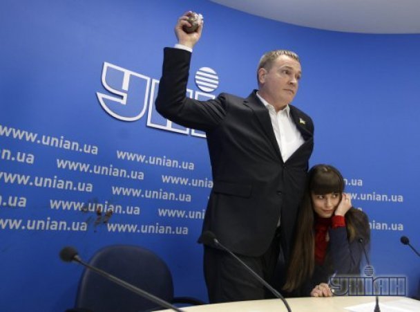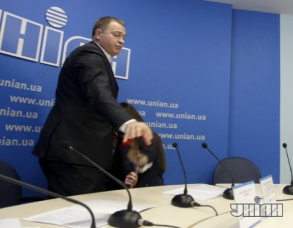 Колесніченко ухилився від кинутих, один із них розірвався на стіні за його спиною. Інший він кинув у зал з журналістами. Народний депутат назвав дівчину «хворою».