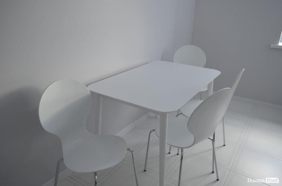 Кухня у квартирі «під ключ» укомплектована найновішою технікою: посудомийною машиною, двокамерним холодильником, витяжкою, духовою шафою, варильною поверхнею. Також тут є сучасний стіл зі стільцями, котрі виготовлені на замовлення і досконало вписуються в інтер’єр.